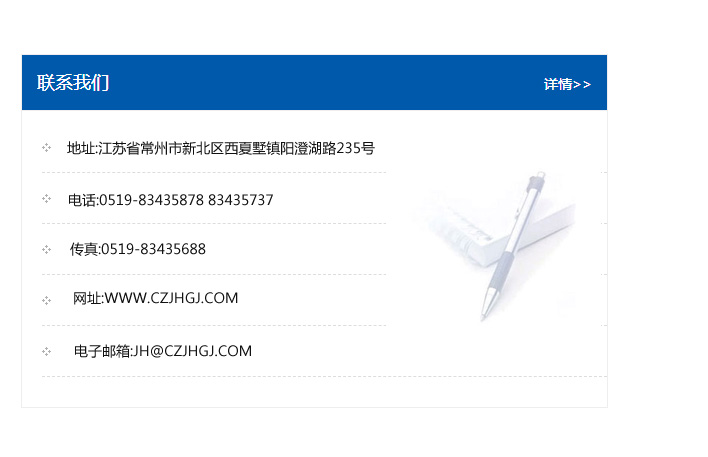 地址:常州市新北區(qū)友邦商務(wù)大廈1幢16、17層  電話:0519-85101652  傳真:0519-85112595  郵編:213022  網(wǎng)址:www_cz-jiayue_cn.cqzx365.com  郵箱:xiajifengaa@163.com